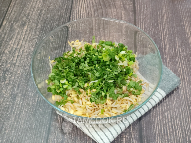 Зелень шинкуем и выкладываем к сое, можно перемешать.