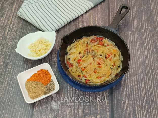 Снимаем сковороду с огня и, пока масло еще горячее, добавляем специи и чеснок, перемешиваем.