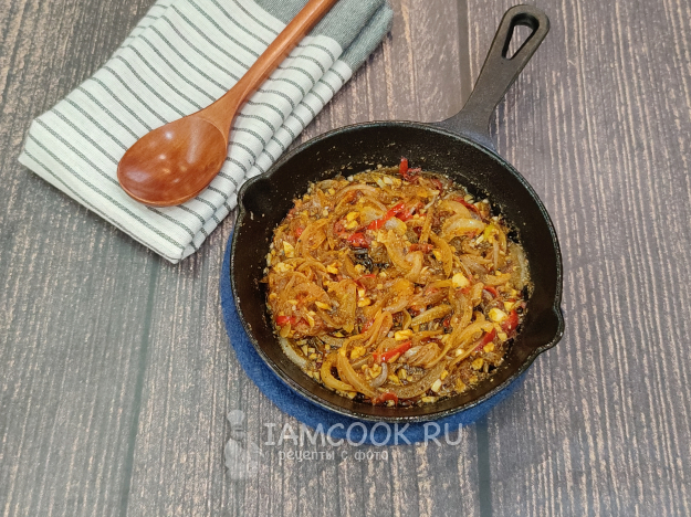 Подготовим заправку. Практически все корейские салаты заправляют одинаковым способом - специи, чеснок заливают раскаленным маслом, это делается для того, чтобы они лучше раскрыли свой вкус и аромат. Можно и по-другому)). В сковороде разогреем масло, обжарим лук до прозрачности, добавим нарезанный чили, обжарим все вместе еще минутку, помешивая.
