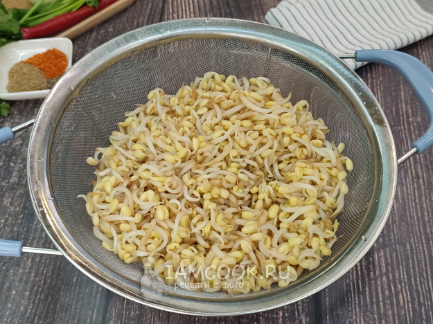 Откинем ростки на сито и оставим, чтобы стекли остатки воды. Объём сои стал несколько меньше, но при этом она осталась хрустящей.