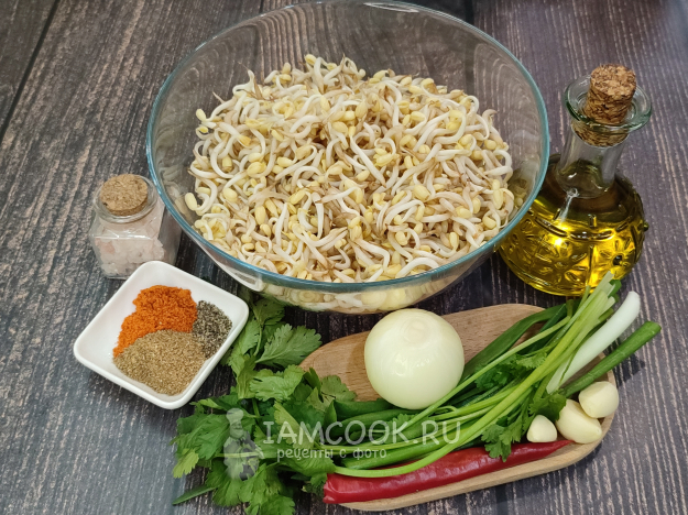 Соберите необходимые продукты для приготовления пророщенной сои по-корейски. Ростки нужно будет перебрать, промыть, удалить остатки зеленой шелухи, если таковая осталась.
