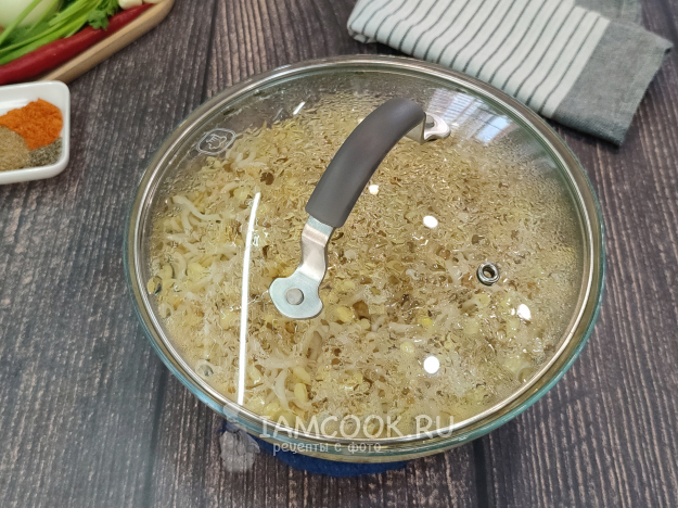Ростки зальём кипятком и оставим буквально на 1 минуту. Можно прикрыть крышкой.