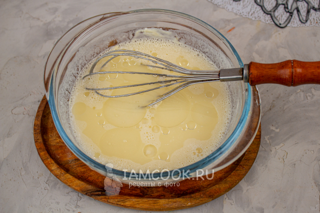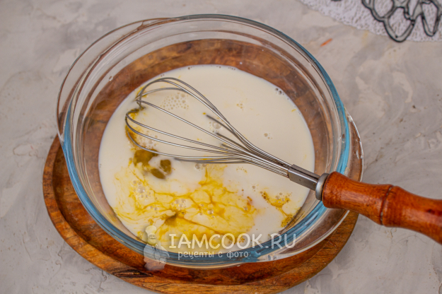 Влейте миндальное молоко, перемешайте тщательно венчиком.