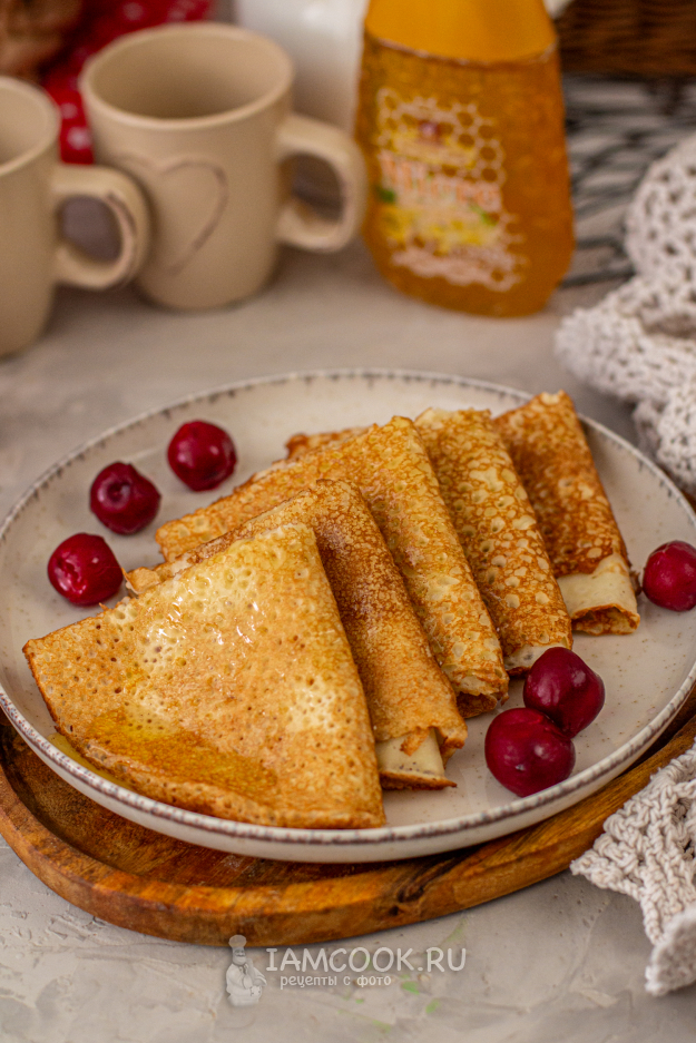 Блины из рисовой муки на миндальном молоке готовы! Подавайте их к столу теплыми с медом, сиропом или сметаной. Приятного аппетита!
