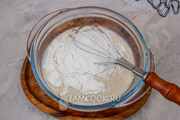 Всыпьте рисовую муку, перемешайте тщательно венчиком, чтобы тесто получилось без комочков.