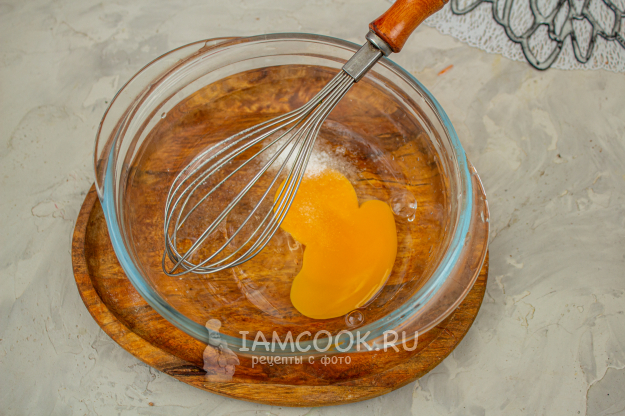 В подходящую миску вбейте куриное яйцо, добавьте соль и сахарозаменитель. Количество подсластителя регулируйте по своему вкусу. Перемешайте венчиком.