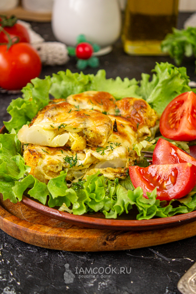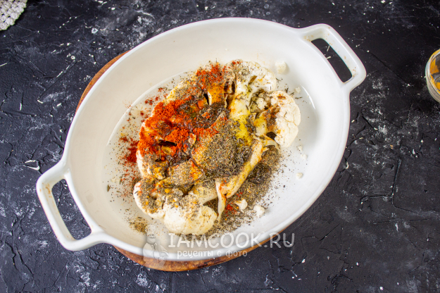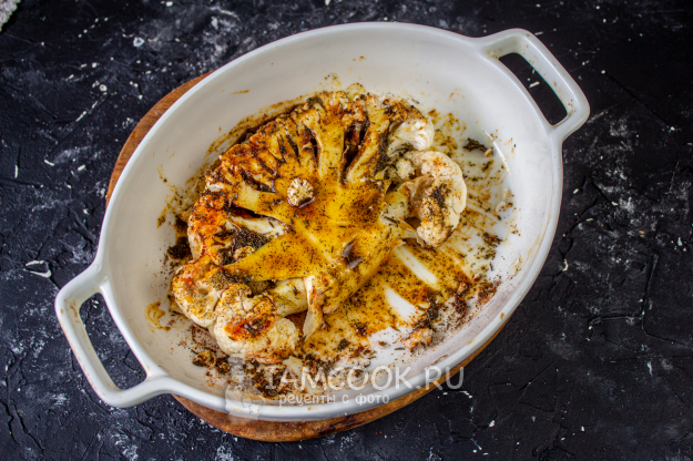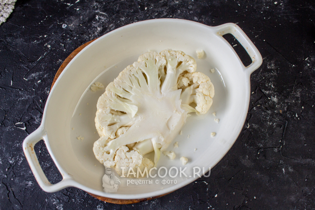 Небольшой кочан цветной капусты при необходимости очистить от потемневших мест, промыть под проточной водой и обсушить. Острым большим ножом нарезать стейки вдоль, толщиной примерно 2,5-3 см, сохраняя при этом соцветия и кочерыжку. Выложить в форму для запекания.