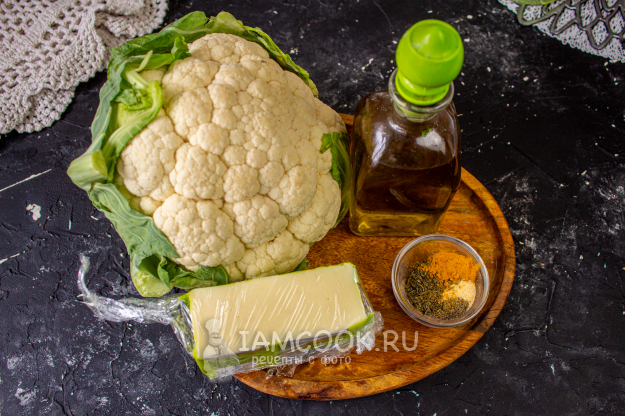 Соберите все необходимые ингредиенты для приготовления стейка из цветной капусты с сыром в духовке.