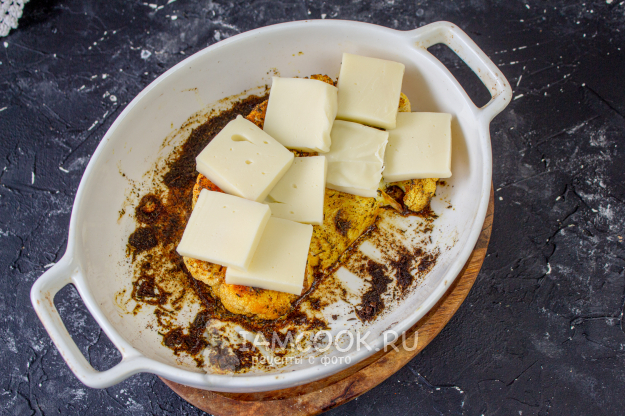 По истечении времени достать капусту из духовки и сверху положить нарезанный сыр. Запекать стейк из цветной капусты с сыром в духовке еще 5 минут при той же температуре. По желанию сыр можно натереть.