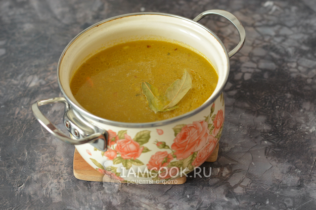 Теперь очередь заправки. Добавьте её в рассольник вместе с парой лавровых листочков. Можете положить свои любимые специи.