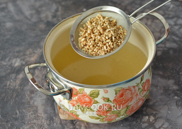 Слейте с замоченной перловки воду (или откиньте на сито) и добавьте в процеженный бульон. Доведите до кипения и варите на среднем огне примерно 20 минут.