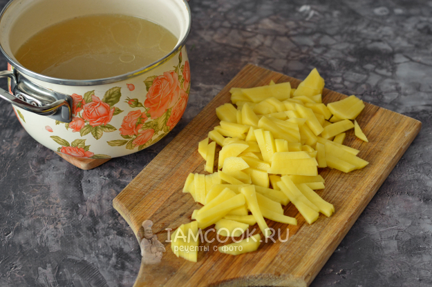 Попробуйте перловку на зубок. Если она стала мягкой, то время закладывать картофель. Нарежьте его брусочками или крупной соломкой и положите в кастрюлю. Варите картофель вместе с перловкой примерно 15 минут (он также должен стать мягким).