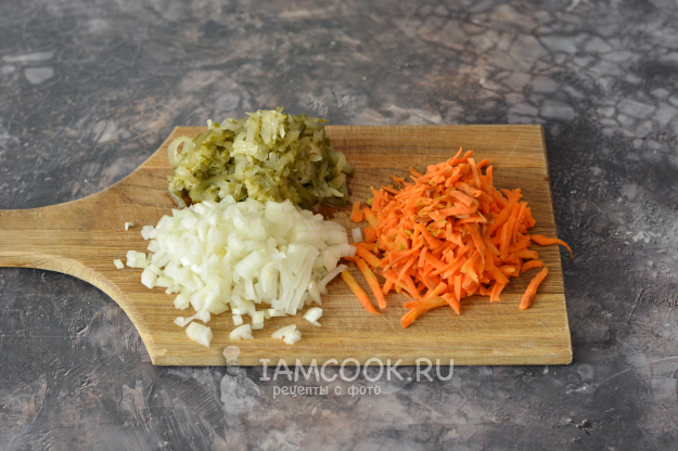 Для этого очистите лук и морковь. Нарежьте мелко лук, а морковку натрите на крупной тёрке. Солёные огурцы также натрите на крупной тёрке.