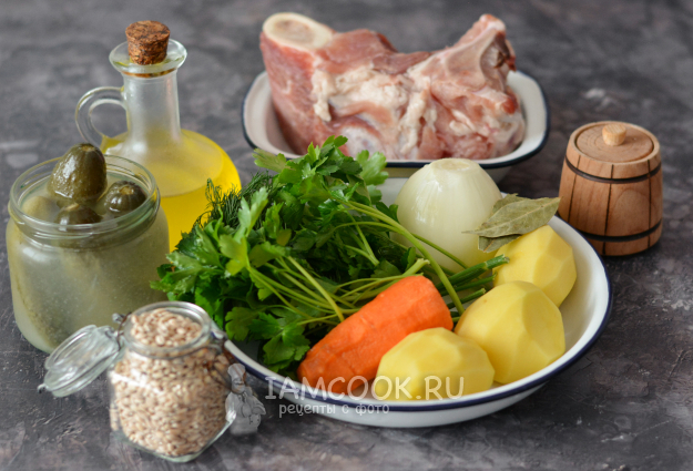 Соберите по списку все необходимые продукты для приготовления рассольника со свининой и перловкой.