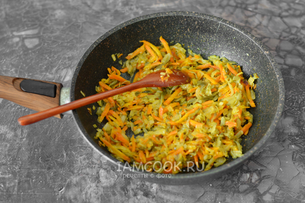 Разогрейте в сковороде на среднем огне растительное масло. Положите в него лук и морковь и обжарьте до золотистого цвета (около 10-15 минут), помешивая лопаточкой. Как только овощи зазолотятся, добавьте к ним натёртые огурцы и продолжайте обжаривать заправку вместе с огурцами ещё 5-8 минут.