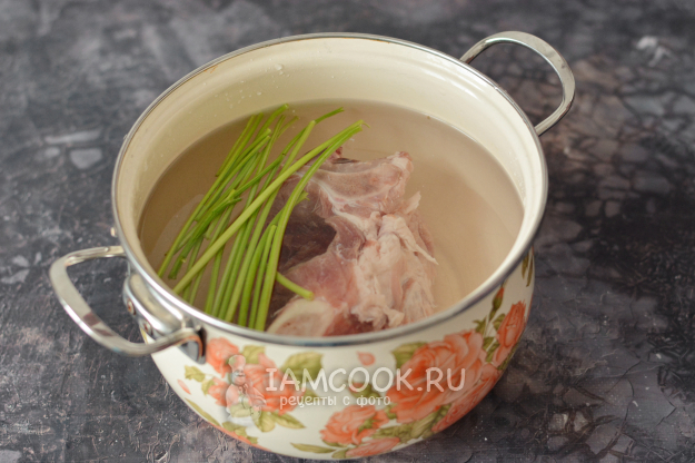 Из готового бульона шумовкой достаньте свинину, снимите всё мясо с костей. А сам бульон процедите через сито в чистую кастрюлю. Веточки петрушки выбросьте, они своё отслужили.