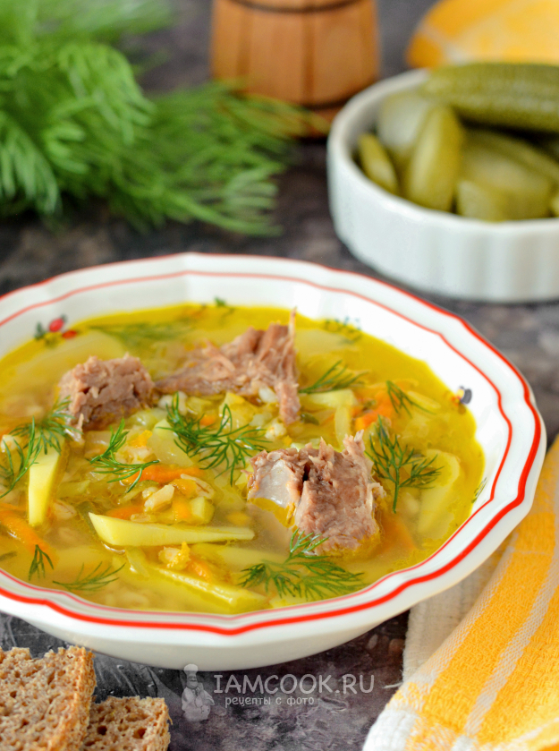 Рассольник со свининой и перловкой готов. Разлейте его по тарелкам и добавьте каждому в тарелку кусочки свинины.