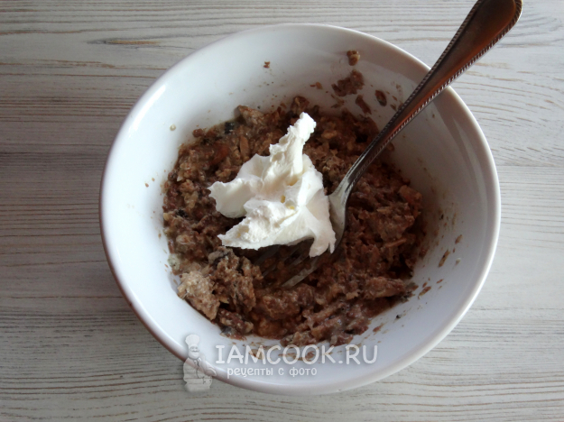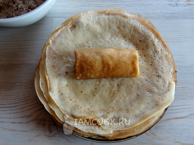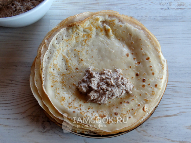 Чтобы нафаршировать блины, надо выложить ложку начинки на край блина.