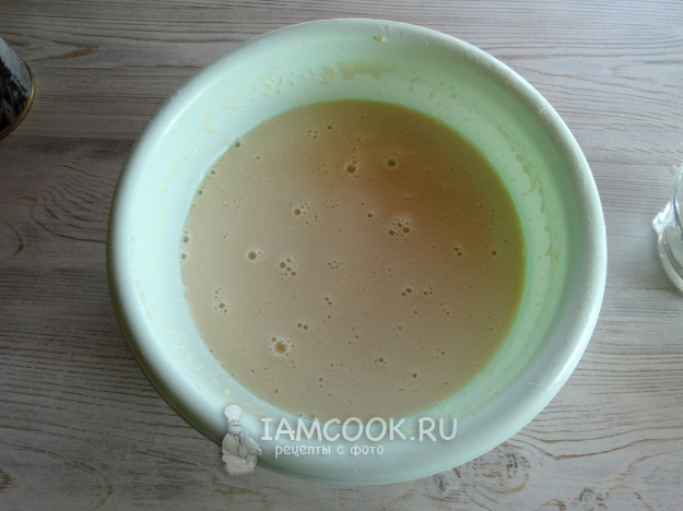 В миску разбить яйца, добавить соль, сахар, масло и воду.