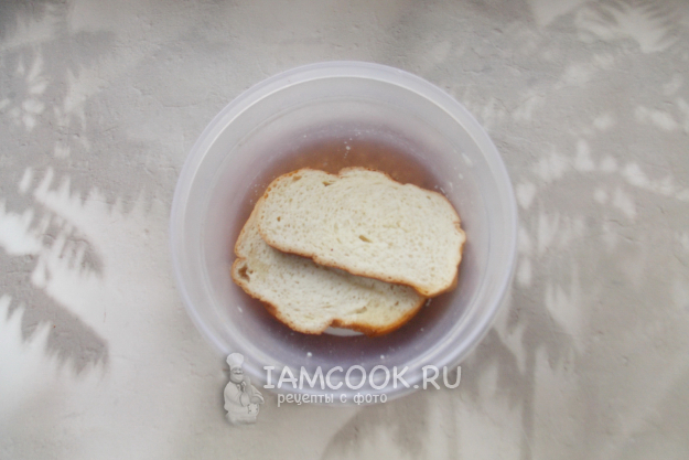 Ломтики белого батона замочите в молоке или в холодной кипяченой воде.
