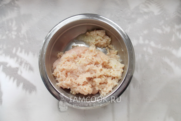 Куриное филе помойте. Лук и чеснок очистите и тоже помойте. Пропустите эти ингредиенты через мясорубку.
