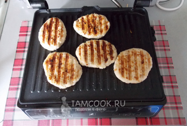 Накройте крышкой электрического гриля и готовьте куриные котлеты 5-6 минут. Периодически открывайте крышку и смотрите на степень готовности котлет. Они должны хорошо подрумяниться. Но пересушивать их тоже не стоит.