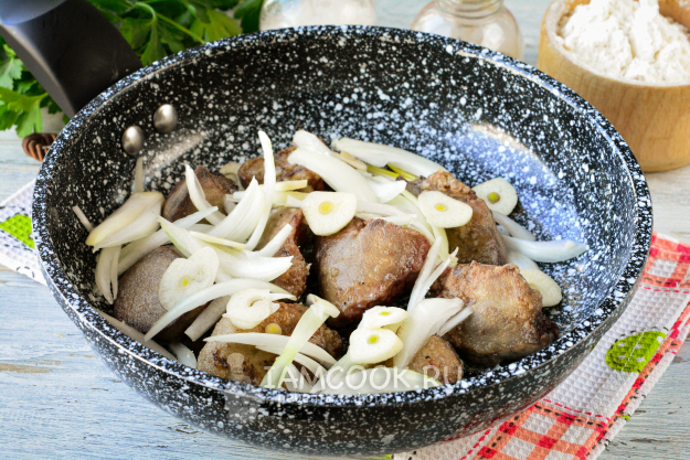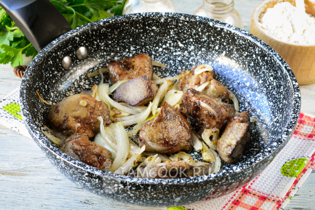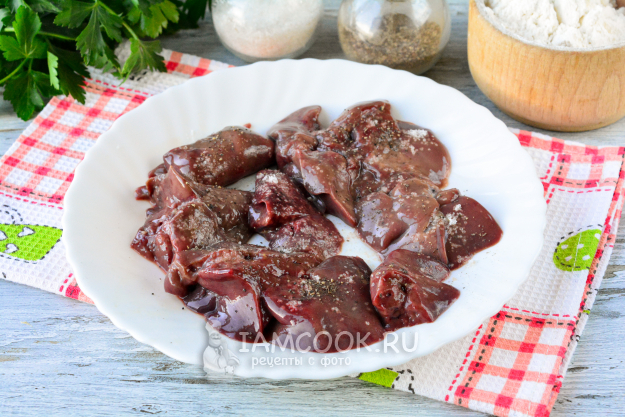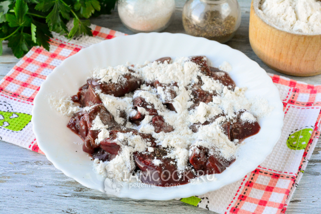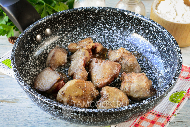 Кусочки куриной печени запанируйте в муке - так она получится вкуснее после обжарки.