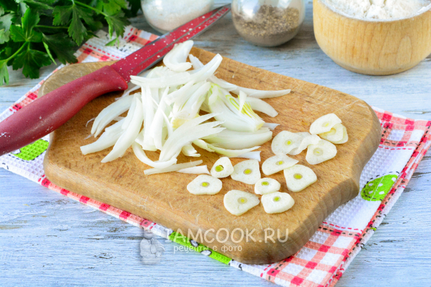 Почистите репчатый лук и зубчики чеснока. Лук нарежьте полукольцами, а чеснок - пластинками.