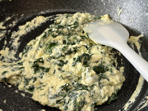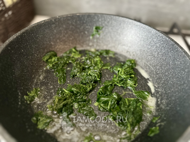 В разогретой сковороде со сливочным маслом прогреть шпинат, помешивая его, чтобы не пригорел. Если вы используете свежий шпинат, его необходимо нарезать и припустить на сливочном масле до момента, когда он начнет увядать.