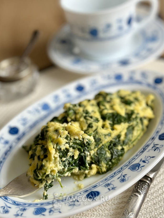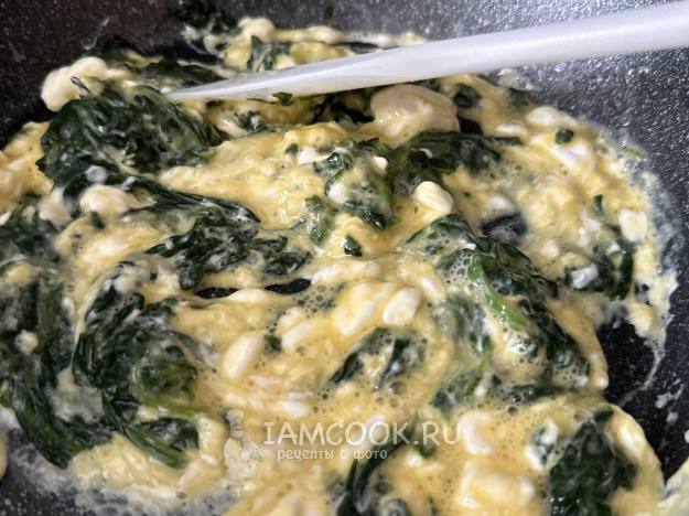 В этот момент нагрев прекратить. Скрэмбл со шпинатом готов. Очень важно не пережарить скрэмбл. Он должен оставаться влажным и нежным.