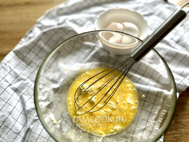 Яйца разбить в чашу для смешивания. Добавить творожный сыр. Взбивать массу не нужно. Достаточно перемешать венчиком. Добиваться однородности тоже не нужно. Творожный сыр может распределяться неравномерно. Можно добавить соль, по желанию.