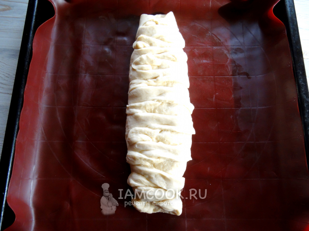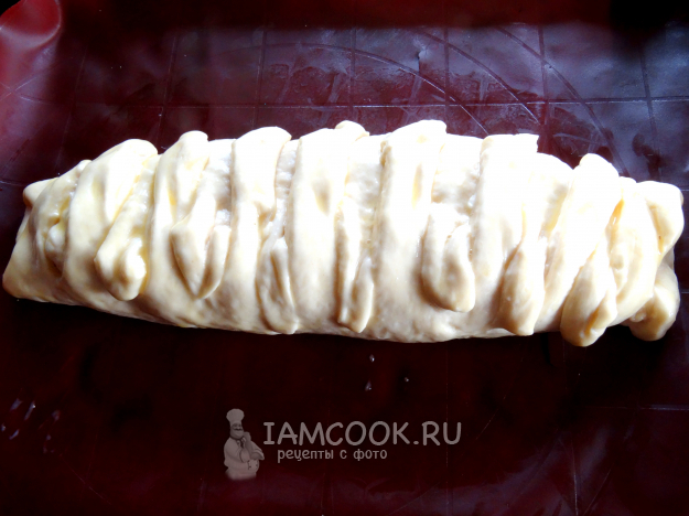 Затем закрыть начинку, подтягивая поочередно полоски теста.