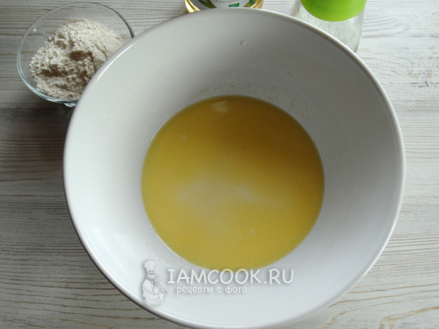 В тёплое молоко добавить сахар, растопленное масло и дрожжи. Перемешать, оставить на 10 минут.