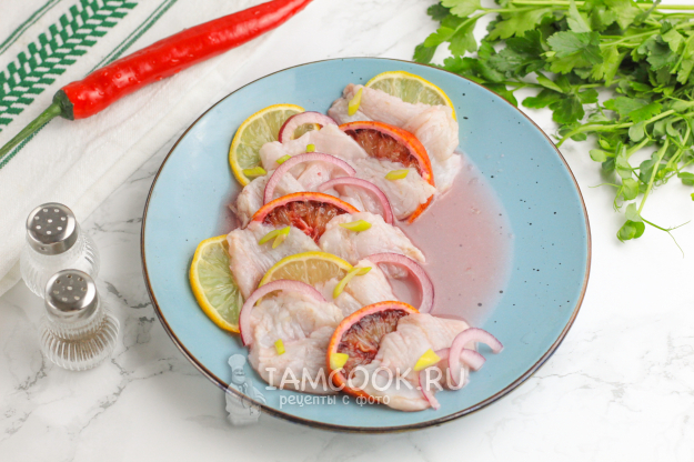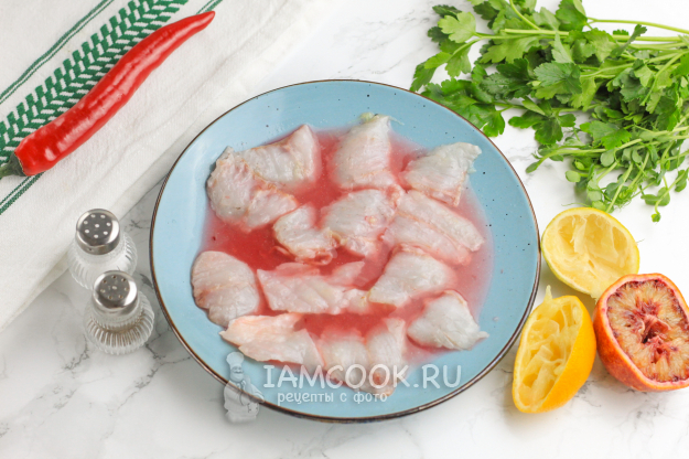 Выжмите сок из половины лайма, лимона и апельсина. Посолите и поперчите кусочки рыбы. Оставьте их в цитрусовом соке на 5-10 минут. Благодаря кислотам произойдет денатурация белка - мясо «побелеет».