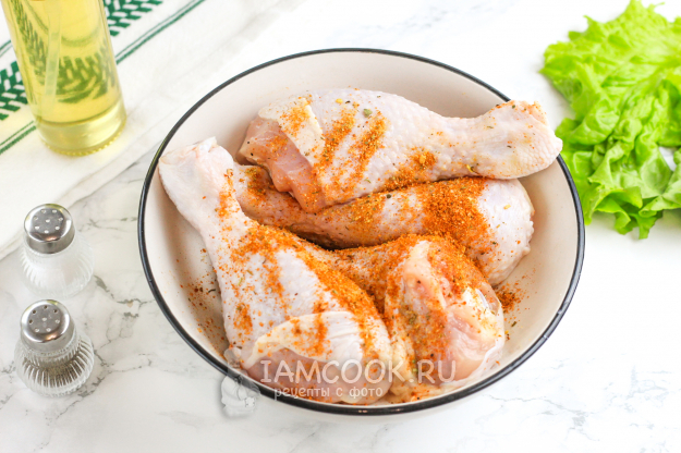 Присыпьте приправой для курицы и тщательно ее вотрите в каждую голень. Можно использовать и другие пряности, специи, но не крупного помола - они подгорят! Тем, кто любит более сочные блюда, могу порекомендовать обмазать голени майонезом или сметаной любой жирности, чесночным соусом.