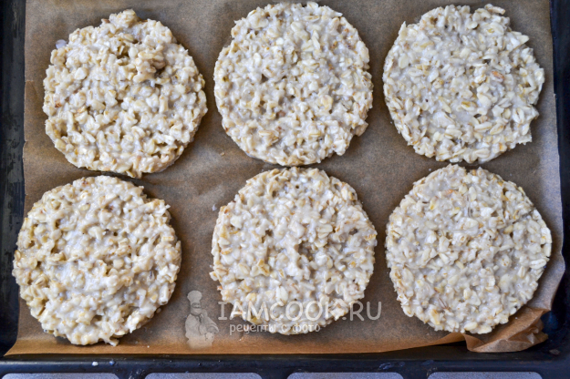 Противень застелите пекарской бумагой и выложите тесто. Можно положить тесто ложкой, можно скатать руками шарики, положить их и расплющить. Я использовала для формовки печенья кондитерское кольцо диаметром 9 см. Положите кольцо на противень, уложите тесто и тыльной стороной ложки расплющите тесто. Получаются заготовки печенья ровной формы и одинакового размера. Из указанного теста получилось 6 печений толщиной примерно 5-7 мм.
