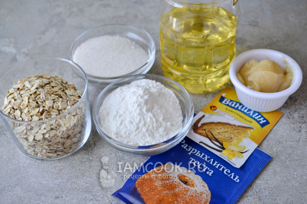 Соберите продукты для приготовления постного печенья из овсяных хлопьев. Хлопья лучше взять длительной варки. Крахмал можно использовать как кукурузный, так и картофельный.