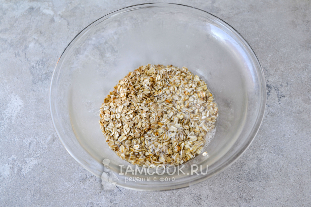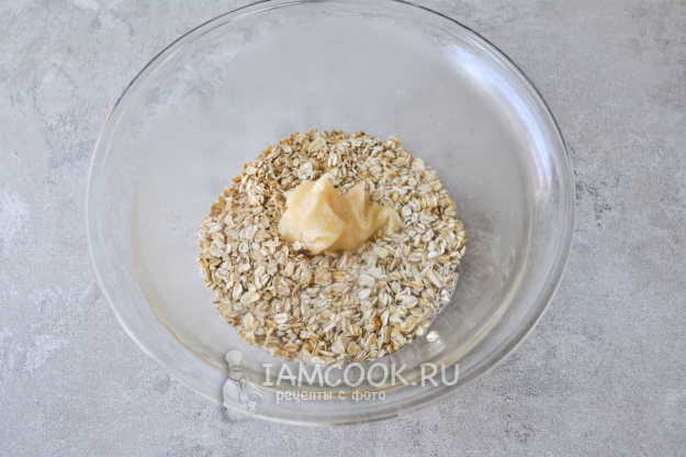 Добавьте в миску мёд, перемешайте. Накройте миску крышкой и оставьте на 10-15 минут, чтобы хлопья набухли.