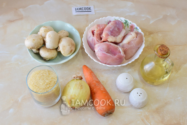 Перед началом приготовления плова с курицей и грибами на сковороде соберите необходимые ингредиенты по списку. Если курица замороженная, то дайте ей полежать при комнатной температуре, чтобы она оттаяла. Рис берите длиннозерный - он меньше разваривается.