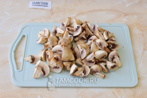 В это время промойте грибы от загрязнений, обсушите и нарежьте крупными кусочками.