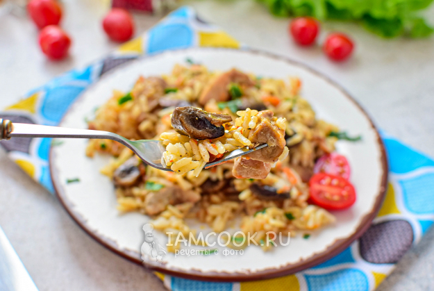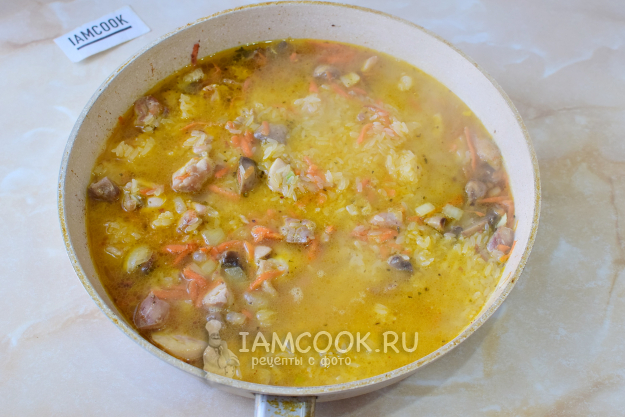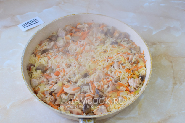 Добавьте в сковороду рис и залейте все горячей водой. По вкусу добавьте соль и специи. Закройте крышкой и готовьте плов с курицей и грибами на сковороде на малом огне минут 20-25, до готовности риса.