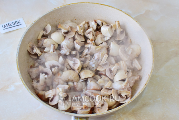 Выложите грибы в сковороду к курице. Перемешайте. Обжаривайте всё вместе еще минут 10.
