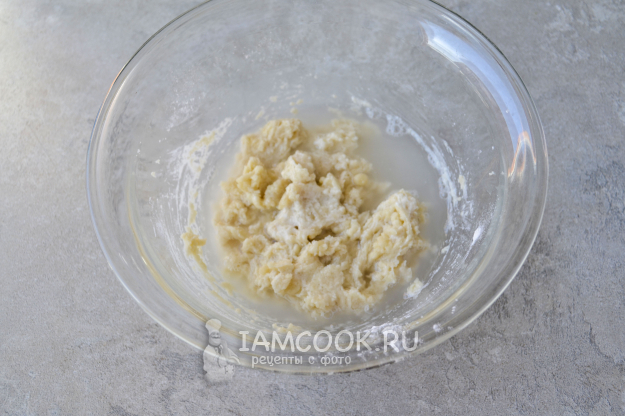 Перемешайте, залейте теплой водой (50 г). Оставьте на кухонном столе.