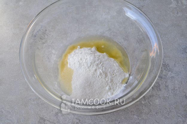 В миску влейте растительное масло, просейте муку, всыпьте сахар, соль, ванилин и разрыхлитель.