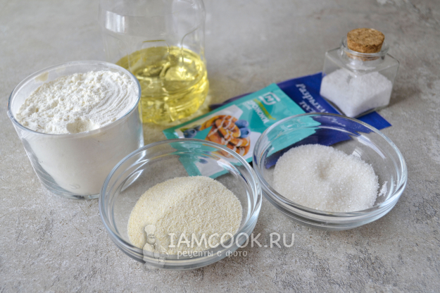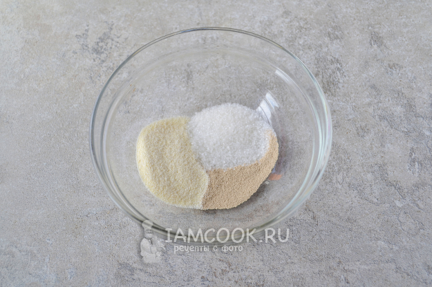 Сначала нужно сделать опару. В небольшую мисочку насыпьте манную крупу, сахар и дрожжи.