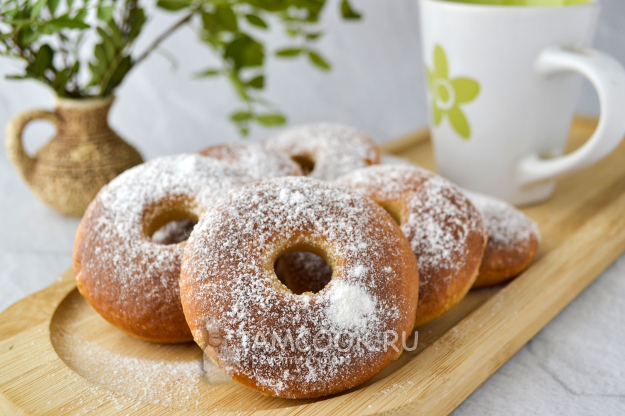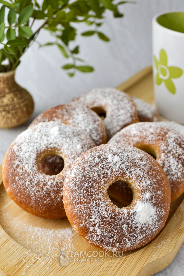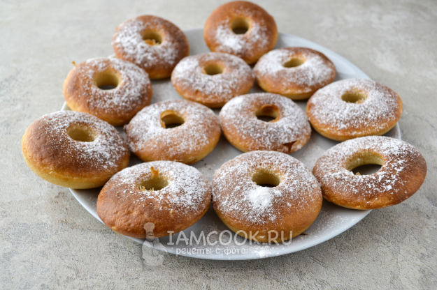 Испеченные пончики аккуратно переложите из форм на тарелку и посыпьте сахарной пудрой, пока они горячие.