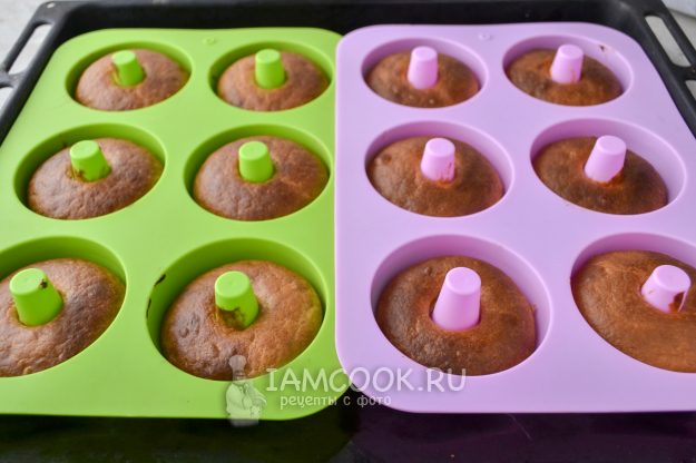 Затем поставьте противень с формами в разогретую до 180°С духовку на средний уровень. Выпекайте постные пончики в духовке 15-20 минут. Ориентируйтесь на свою духовку.