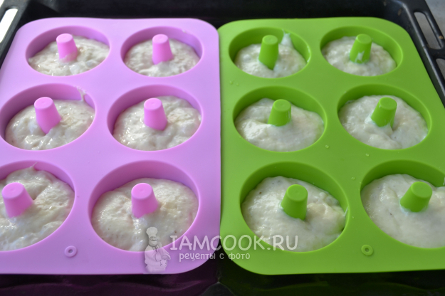 Формы для пончиков аккуратно заполните тестом примерно на половину высоты. Прикройте формы пищевой пленкой на 15-20 минут.