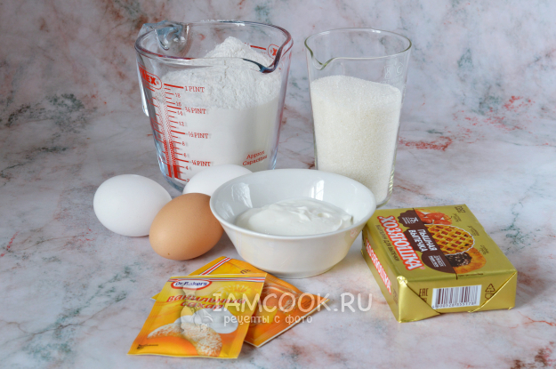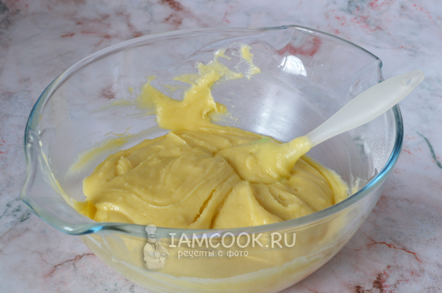 Влить растопленный и остывший маргарин (или сливочное масло), перемешать. Добавить сметану и еще раз хорошо перемешать венчиком.
