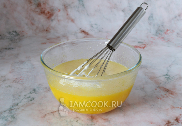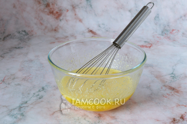 В емкость разбить яйца, всыпать сахар, ванильный сахар и соль. Слегка взбить венчиком.